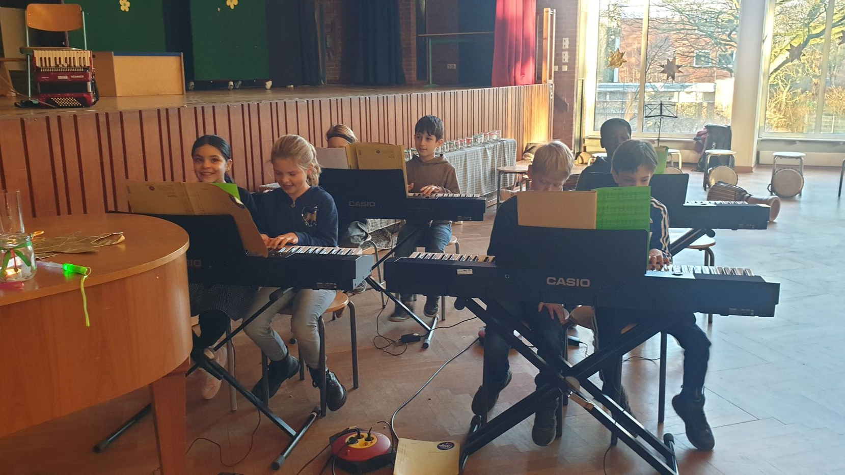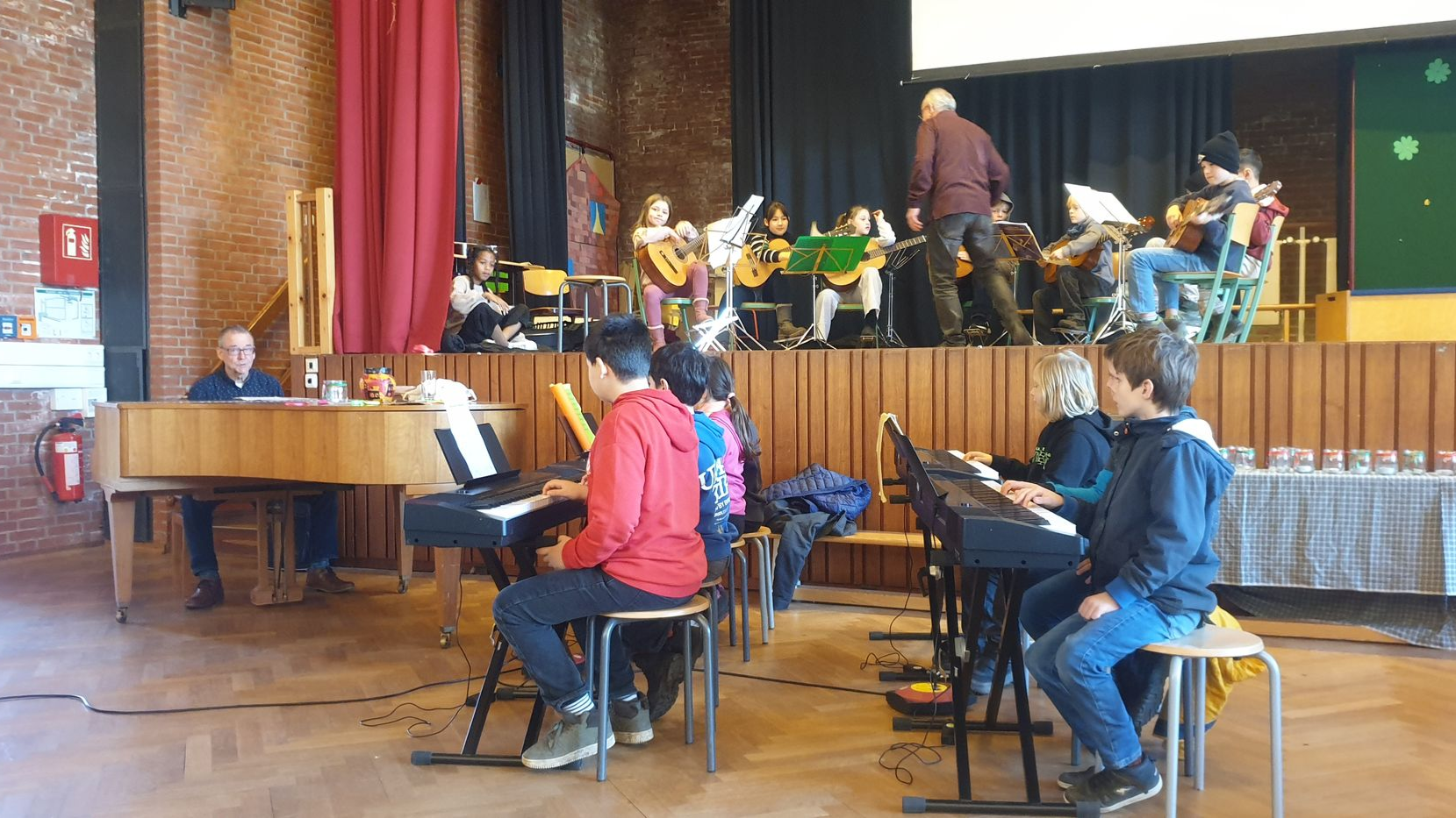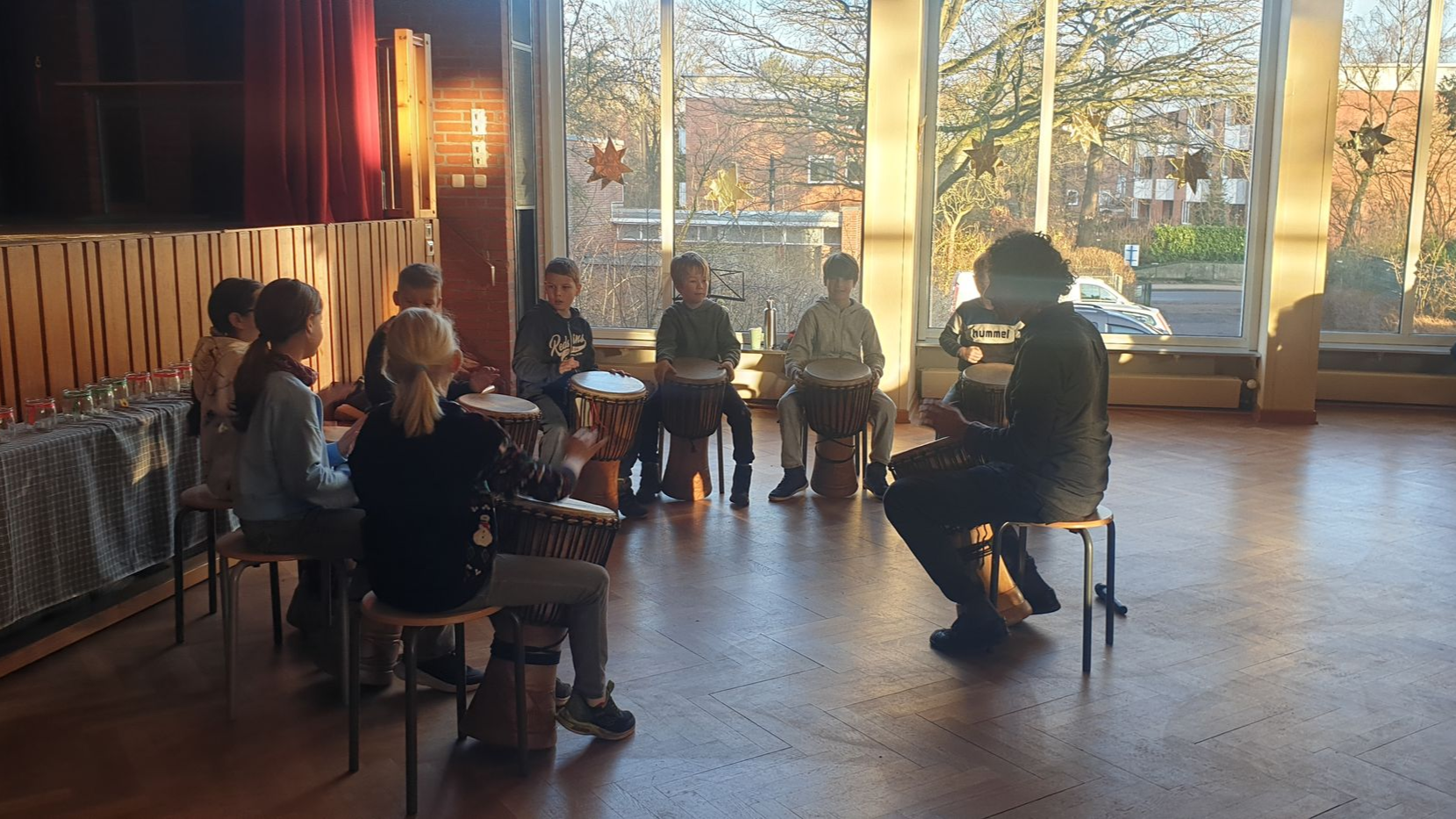 Weihnachtliche Klänge auf dem Keyboard, am Akkordeon, an der Geige und der Gitarre ertönten durch die Aula – gemeinsam wurde unter der Begleitung des Keyboard-Lehrers „In der Weihnachtsbäckerei“ geschmettert, und zum Abschluss begeisterten die fleißigen Trommler mit weihnachtlichen Rhythmen.